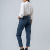 Tiene 5 bolsillos. Corte a la cintura, relajado en caderas, botamanga semi ajustada.