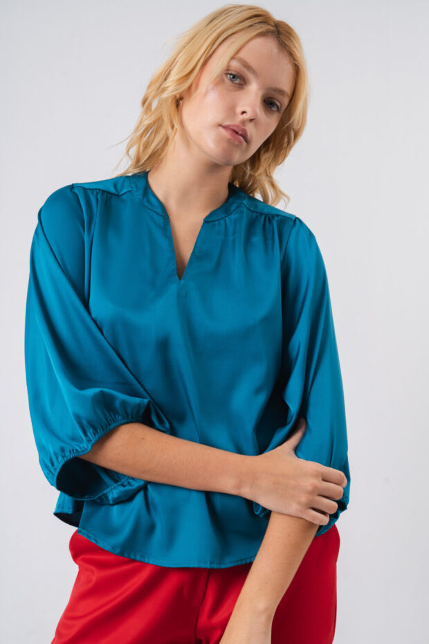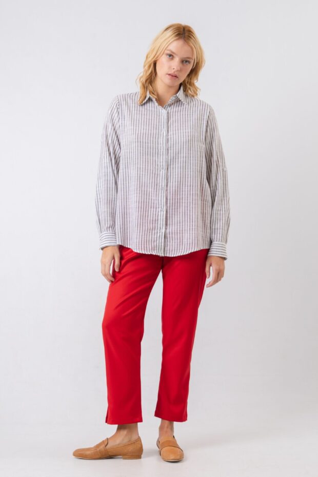 Confeccionado en un sastrero con cuerpo, este color te va a ayudar a ponerle color a tus looks. Usalo con la Camisa Recta Rayas o animate a usar complementarios con la Blusa Fly verde