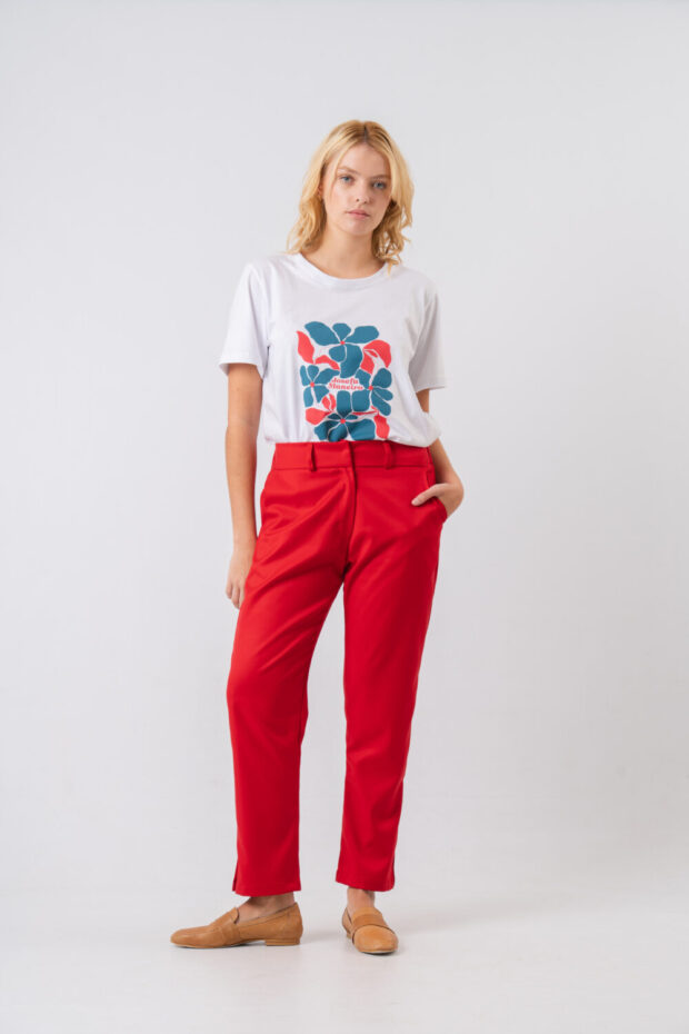 De tiro medio, largo al tobillo y angosto. Tiene elástico en cintura de espalda, lo que le da cierta flexibilidad en la medida de cintura.