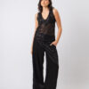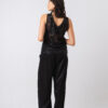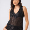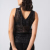 Básica y sofisticada, escote en V en frente y espalda, realizada en tul bordado con lentejuelas negras. Usalo con el Pantalón Palazzo para un look nochero o con el Jean Mom Blanco para una salida de tardecita.